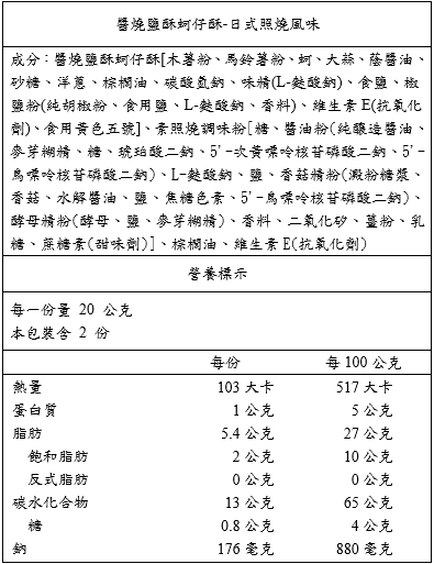 成分:醬燒鹽酥蚵仔酥[木薯粉、馬鈴薯粉、蚵、大蒜、蔭醬油、砂糖、洋蔥、棕櫚油、碳酸氫鈉、味精(L-麩酸鈉)、食鹽、椒鹽粉(純胡椒粉、食用鹽、L-麩酸鈉、香料)、維生素E(抗氧化劑)、食用黃色五號]、素照燒調味粉[糖、醬油粉(純釀造醬油、麥芽糊精、糖、琥珀酸二鈉、5'-次黃嘌呤核苷磷酸二鈉、5'-鳥嘌呤核苷磷酸二鈉)、L-麩酸鈉、鹽、香菇精粉(澱粉糖漿、香菇、水解醬油、鹽、焦糖色素、5'-鳥嘌呤核苷磷酸二鈉)、酵母精粉(酵母、鹽、麥芽糊精)、香料、二氧化矽、薑粉、乳糖、蔗糖素(甜味劑)]、棕櫚油、維生素E(抗氧化劑)